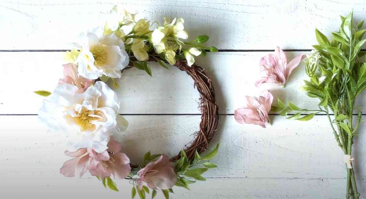 100均の素材を使った、春色リースの作り方をご紹介します。花材の他に、ワイヤーや針金、グルーガンをご用意くださいね。