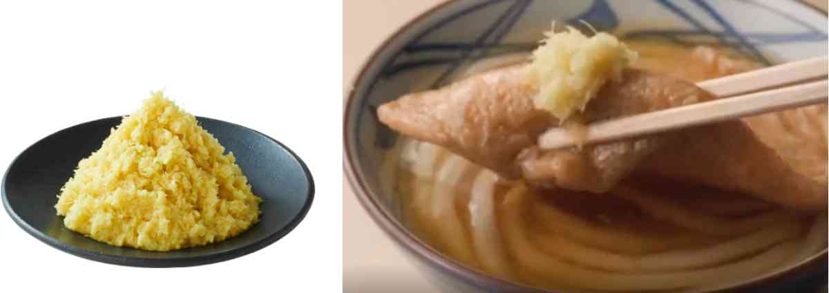 しょうがの繊維を程よく残し、すっきりとした辛みと香りが楽しめる「おろししょうが」は、「きつねうどん(温)」など温かいかけだしに絡めると、鼻から抜ける香りで心地よい後味になるのだそう。じゅわっと甘いきつね揚げと、甘みが溶けだしたかけだしに「おろししょうが」を入れると、さっぱりと楽しめるのだそう。