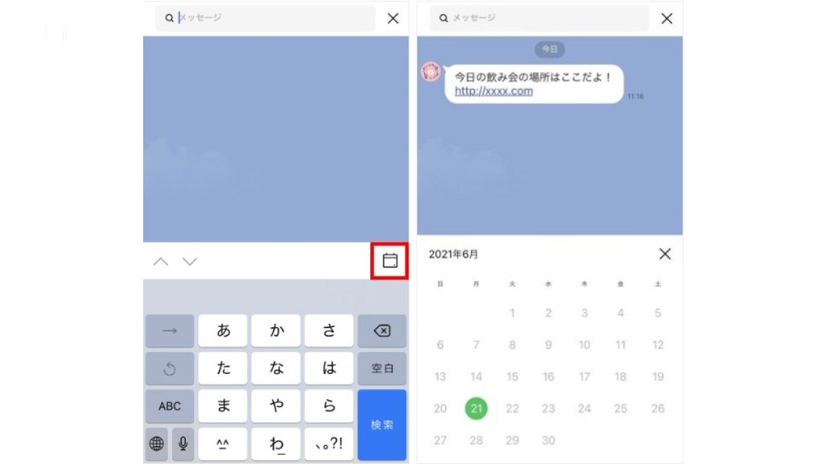 「あの時の約束、いつだったかな?」「大事な情報が埋もれてしまった」そんな時に役立つのが「トーク内検索」機能です。トークルームの虫眼鏡マークをタップし、キーワードを入力して探すか、カレンダーマークから日付を選んで目的のメッセージを素早く見つけることができます。写真や動画の各上部をクリックして、関連トークに飛ぶことも可能です。