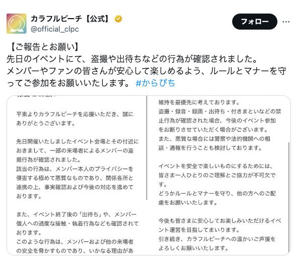 実況者グループ「カラフルピーチ」(登録者数230万人)が公式Xを更新し、イベント会場とその付近で発生した盗撮や出待ち、メンバー個人への過度な接触・執着行為といった迷惑行為に対し、警告を行いました。
