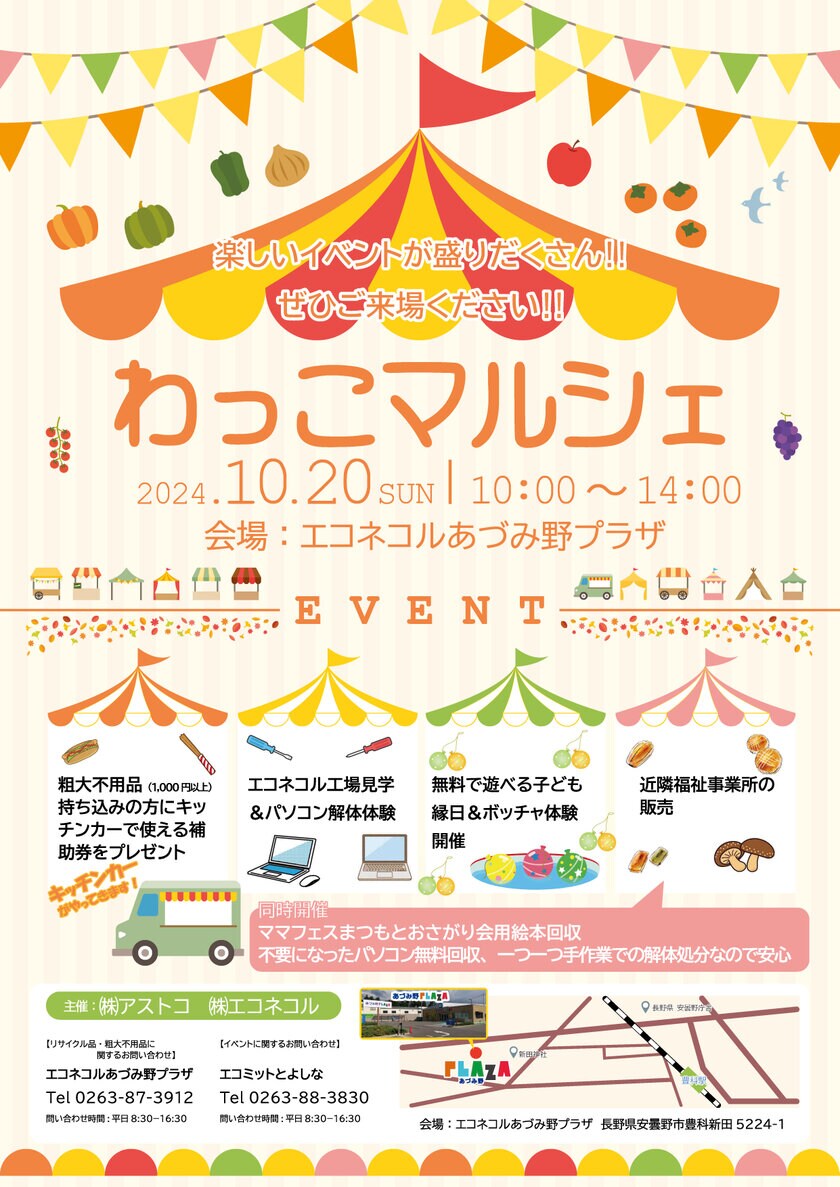 株式会社アストコは、長野県の地元農家や地域企業から仕事を受け、障がいのある方の就労移行・継続支援を行っています。この第2回わっこマルシェは、地元の方々と笑顔を共有し、地域との結びつきを深めることを目的としています。イベント当日はリサイクル工場の見学やパソコン解体の作業体験、ボッチャ体験、子供縁日、近隣福祉事業所の販売などが行われます。出店情報