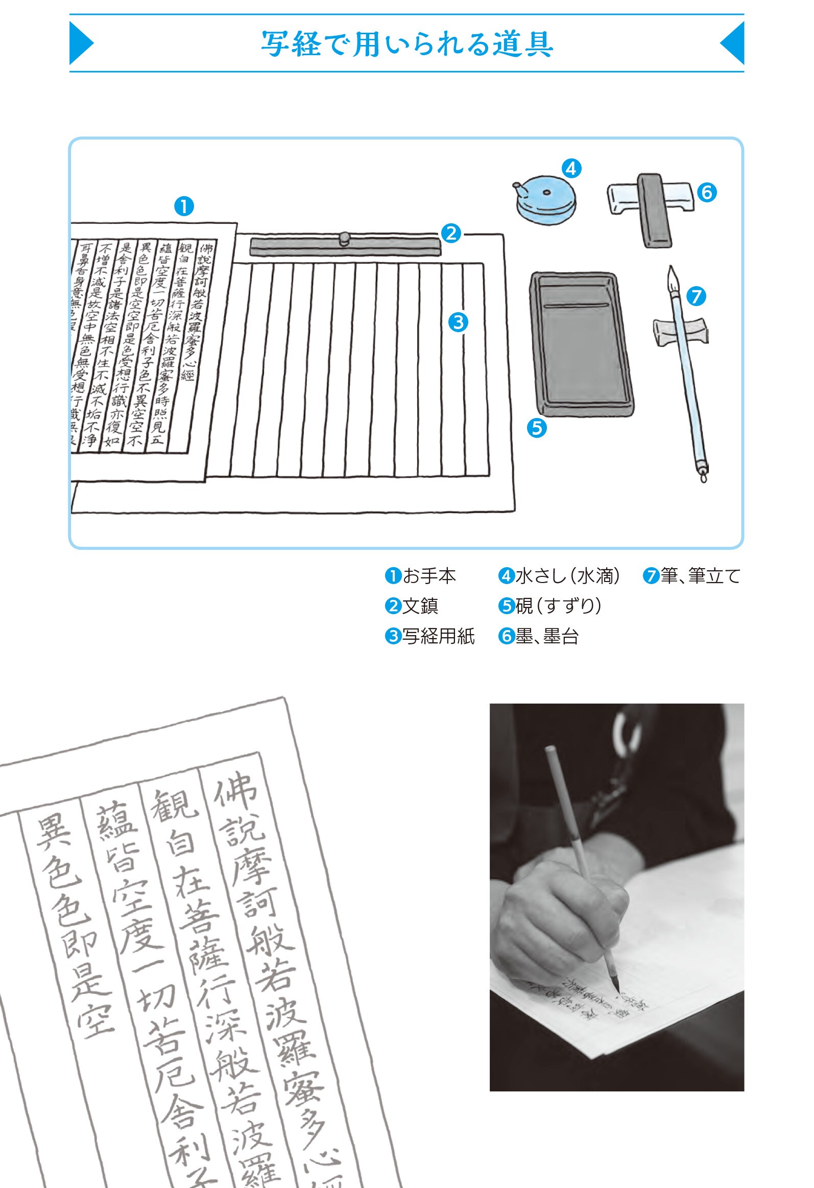 写経は、静かで清潔な場所で、やはり手や口を浄(きよ)めてから、心を落ち着けて行いましょう。
