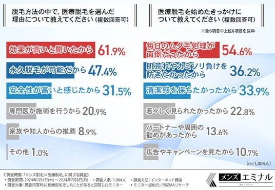 約6割の方が高い効果を期待して医療脱毛を選んでおり、始めたきっかけはムダ毛処理が面倒だったからと回答した方が半数以上でした。毎日のムダ毛処理を負担に感じている男性が多いようです。