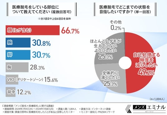 医療脱毛をしている部位については、約7割の方が「顔(ヒゲ含む)」と回答し、目指す状態としては自己処理する頻度を減らすことを重視している方が約半数であることが示されました。特に顔(ヒゲ含む)のムダ毛処理に負担を感じ、自己処理の回数を減らすために医療脱毛をする男性が多いようです。