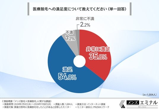 「医療脱毛への満足度について教えてください(単一回答)」と質問したところ、『非常に満足(35.8%)』『満足(54.8%)』『不満(7.2%)』『非常に不満(2.2%)』という回答結果になりました。