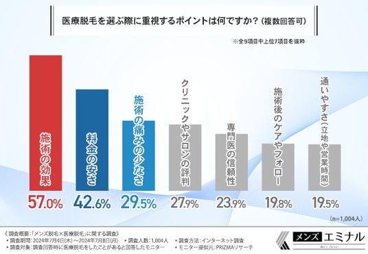 「医療脱毛を選ぶ際に重視するポイントは何ですか?(複数回答可)」と質問したところ、『施術の効果(57.0%)』と回答した方が最も多く、『料金の安さ(42.6%)』『施術の痛みの少なさ(29.5%)』と続きました。