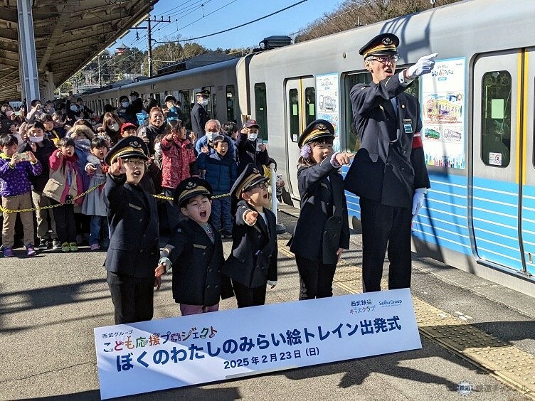 続くセレモニーでは、西武HDの原田武夫上席執行役員・経営企画本部長があいさつ。子どもたちの代表4人が、西武鉄道鉄道本部運輸部の山本徳之所沢管区長とともに出発合図を送り、列車は動き出しました。