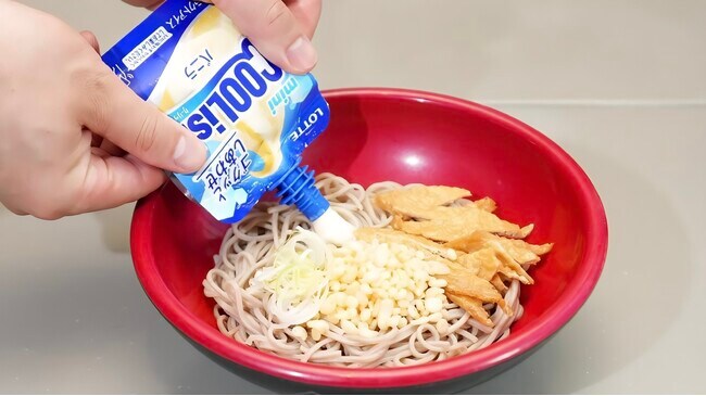 ロッテの“飲むアイス”「クーリッシュ」と名代富士そばの初となるコラボレーション商品です。夏の暑い時期にぴったりな「冷やしたぬきそば」に「ミニクーリッシュ バニラ」をトッピングするメニューです。