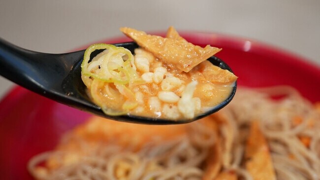 たぬきそばだけでもお楽しみいただけますが、「ミニクーリッシュ バニラ」と「七味唐辛子」をトッピングすると、名代富士そばならではの甘辛いつゆにコクが出て、絶妙な味わいを楽しめます。