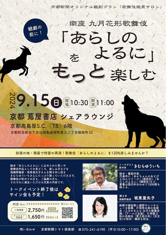 京都新聞では、歌舞伎「あらしのよるに」をもっと楽しむためのオリジナルプラン「歌舞伎鑑賞サロン」をご用意しました!原作者きむらゆういちさんによるトークイベントです。聞き手には演劇評論家の坂東亜矢子さんを迎え、絵本「あらしのよるに」に込められた思いや、歌舞伎作品としての見どころ、楽しみ方などを語っていただきます。歌舞伎初心者にもおすすめのプランです。