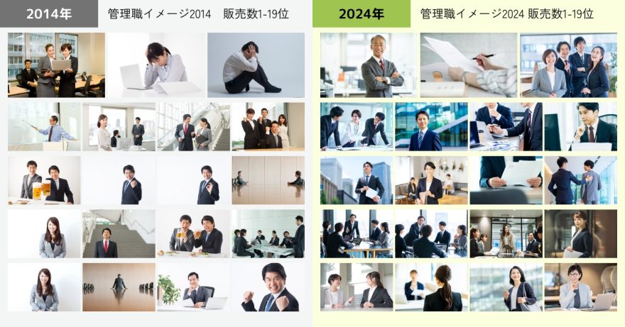 管理職に関する写真では「女性管理職のイメージ」は3倍に増加。ただ男性の管理職イメージの方が女性の2.2倍多く、依然として「管理職=男性」の意識は根強いようだ。一方で男女混合のビジネスシーンでは、10年前と比べて関係性がフラットになっており、職場のジェンダー観の変化も見て取れる結果となった。