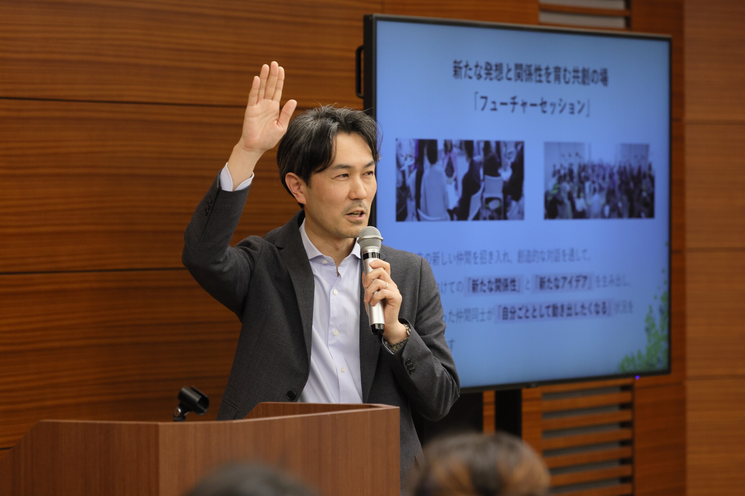 グループワークは、株式会社フューチャーセッションズ(東京)が提唱する「フューチャーセッション」の形式で進行した。同社代表取締役の有福英幸氏は、「未来に向かってどう進んでいくか皆のアイデアを出し合って共創していく」という「未来思考」の考え方を解説。参加者たちは4~5人のグループに分かれ、「ありたい姿(フューチャー)のために企業ができるアイデア」を議論。20分ごとの議論の後にメンバー入れ替えを2回繰り返し、より多くの参加者と対話する形式を取った。