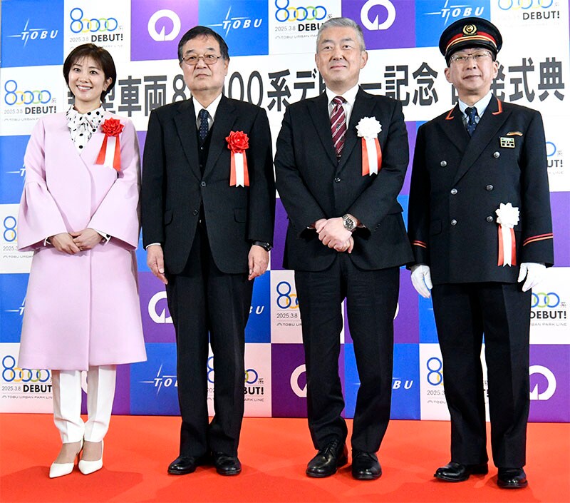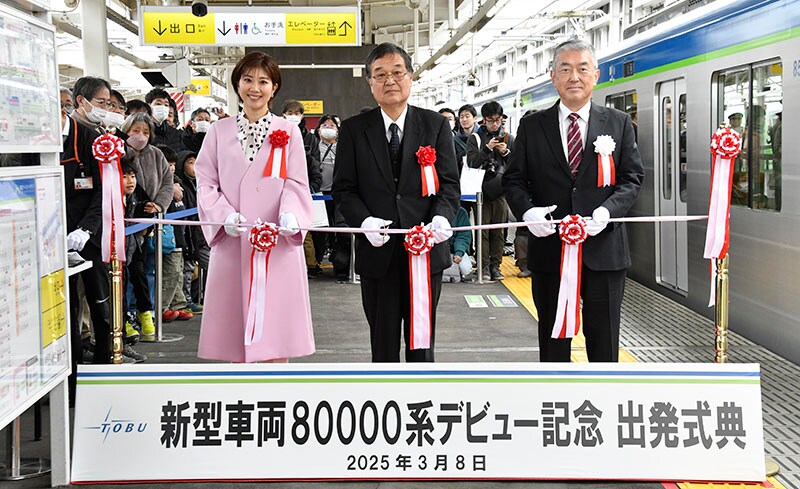 80000系 営業運転初日には、野田市駅で出発式が開かれ、東武鉄道 鈴木孝郎 取締役常務執行役員 鉄道事業本部長、野田市 今村繁 副市長、そして元バドミントン日本代表で2児の母の潮田玲子ママが駆けつけ、「しゅっぱーーーつ、進行!」。