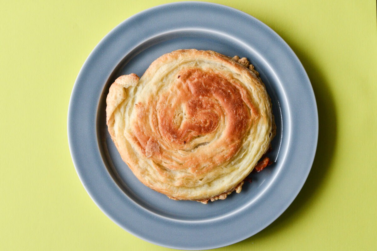 「チーズとベーコンの平焼きデニッシュ」をお皿に出しました。