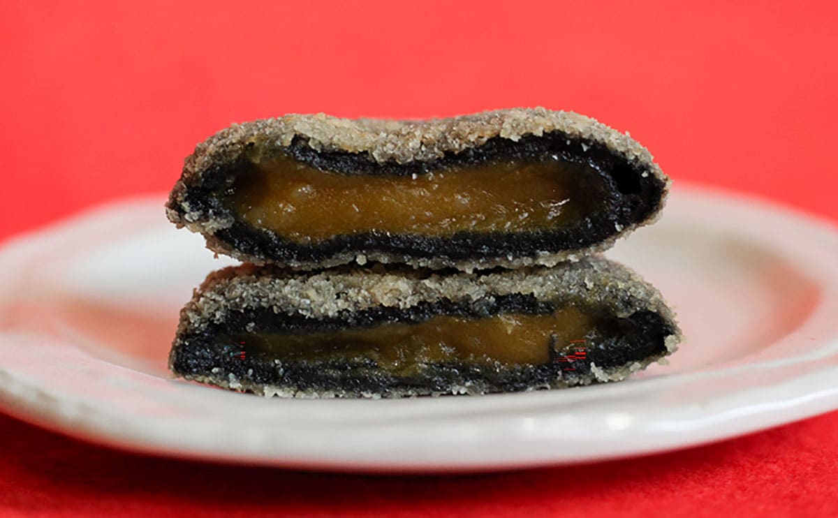 半分に切ってみると、中から黄色いかぼちゃソースが出てきました。黒×黄というカラーリングもハロウィンっぽいですよね。3月だけど。