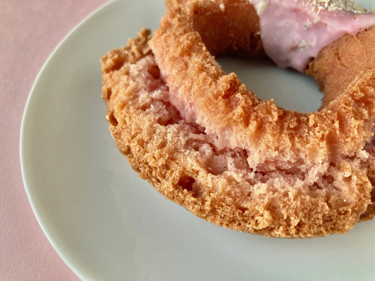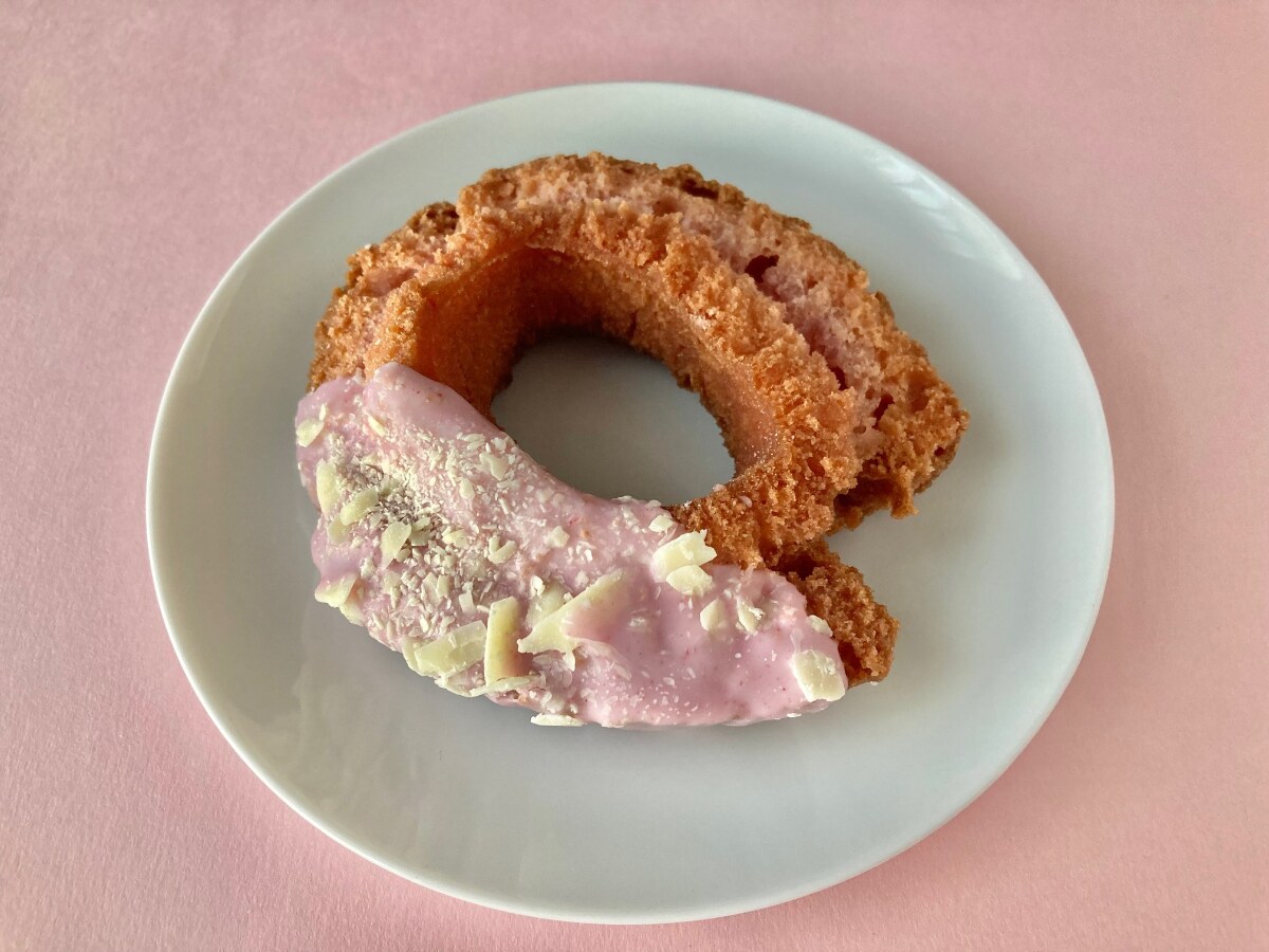 「桜ベリーオールドファッション」をさっそく開封。オールドファッションらしい、香ばしい匂いが広がります。