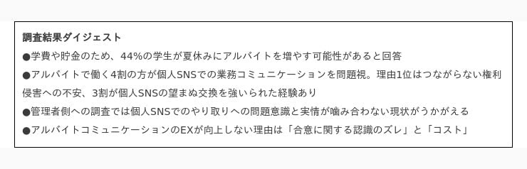 夏休みは、例年学生のアルバイト活動が盛んな時期となります。人手不足やスポットワークの台頭等を背景に、掛け持ちが増え、シフトのやり取りなどアルバイト関連のコミュニケーションが活発になる中で、「つながらない権利(※3)」の深刻化が懸念されます。特に、アルバイトが多く活躍する飲食業や販売業などでは個人的なSNSの業務連絡利用が常態化していることが多く、「プライベートな領域で、合意なくつながられている状況」も起きています。本調査ではこのような状況を踏まえ、つながらない権利の実態を調査しました。