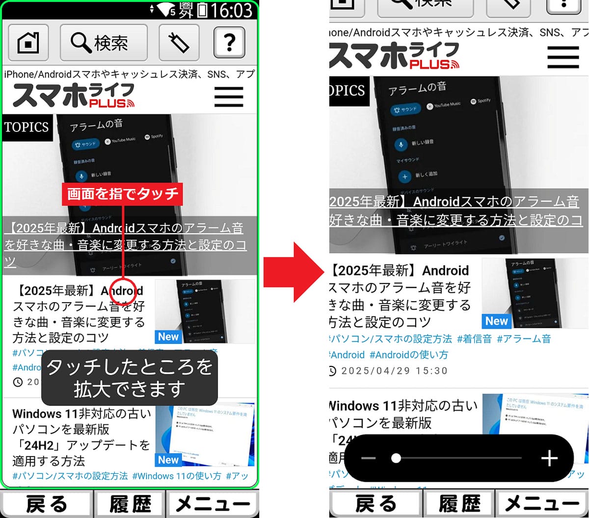 そのようなときは、画面を指2本でピンチアウトすれば画面を拡大できるのは、皆さんご存じでしょう。