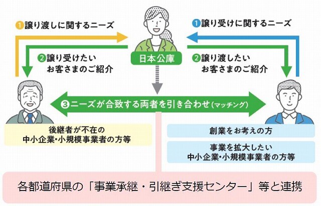 マッチングの仕組みはこうだ。日本公庫と取引がある中小企業・小規模事業者で、後継者がいないため会社を譲り渡したいという経営者がリストに登録。日本公庫が間に入り、創業したいとか事業を拡大したいという登録者との希望条件と合えば、両者の引き渡しのお膳立てをする。登録は無料だ。