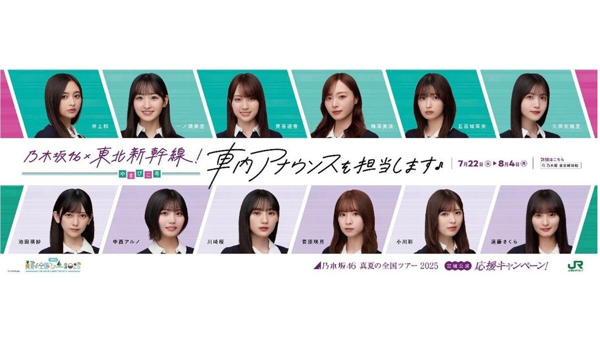 JR東日本が、乃木坂46「真夏の全国ツアー2025」宮城公演に合わせて、「宮城公演応援キャンペーン」を実施します。乃木坂46「真夏の全国ツアー2025」宮城公演は、、2025年8月2日から3日に開催されます。昨年も好評だった東北新幹線での乃木坂46メンバーによる車内放送が大幅にバージョンアップするほか、今年はスマートフォンで楽しめるコンテンツも用意されるとのこと。乃木坂46ファンにはたまらない、特別なコラボ企画をぜひお見逃しなく!