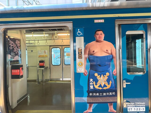 さらに、市内を走る「えちごトキめき鉄道」では大の里ら海洋高校出身力士が描かれたラッピング電車を運行中。この写真の大の里は入門してまだ日が浅く、髪は大銀杏(おおいちょう)を結うには足りずにちょんまげ姿。関係者によれば「今の横綱の写真に取り替える計画はある」とのことだった。