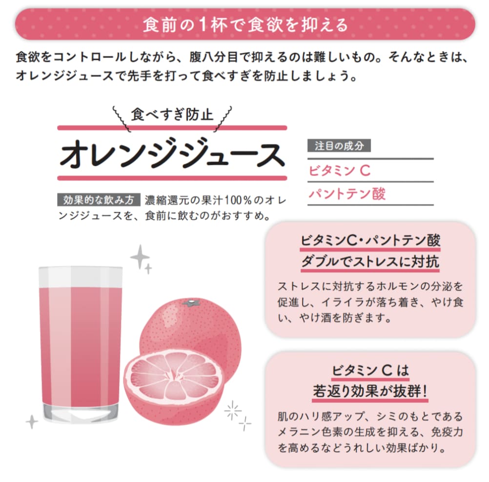 食欲が暴走しそうなときは、コップ1杯の水分を胃に入れておくと、食欲を高めるホルモンの分泌を減らすことができます。オレンジジュースがイチオシなのは、ビタミンCとパントテン酸が豊富だから。ビタミンCは、シミのもとになるメラニンを抑えて肌にハリをもたらし、体の老化にブレーキをかけて免疫力を高めるなど、積極的にとりたいビタミンで、ストレスに対する抵抗力もアップします。パントテン酸は、ビタミンB群の1種でエネルギーの代謝を助け、ストレスに対抗するホルモンの分泌を促します。2つの栄養素が力を合わせてイライラを鎮め、やけ食いを防いでくれるのです。