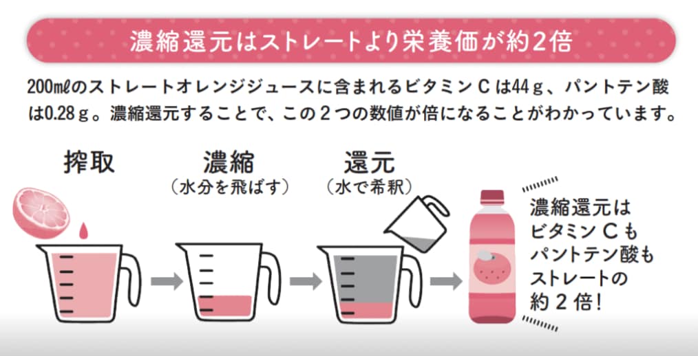 200mlのストレートオレンジジュースに含まれるビタミンCは44g、パントテン酸は0.28g。濃縮還することで、この2つの数値が倍になることがわかっています。
