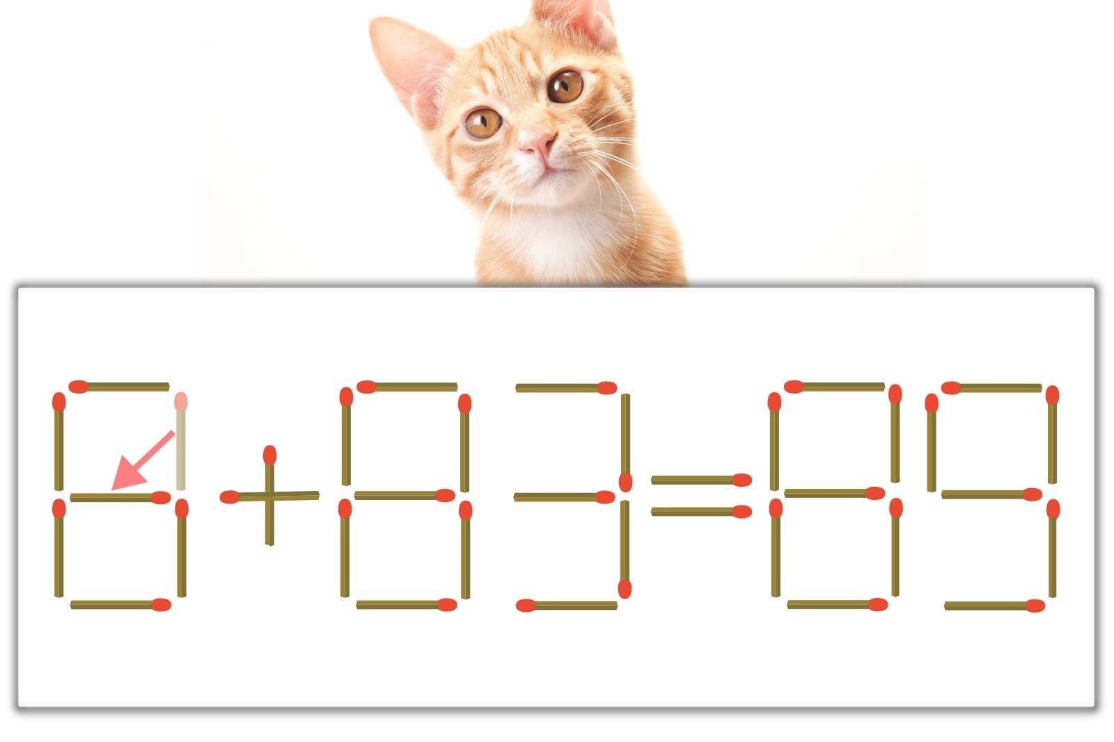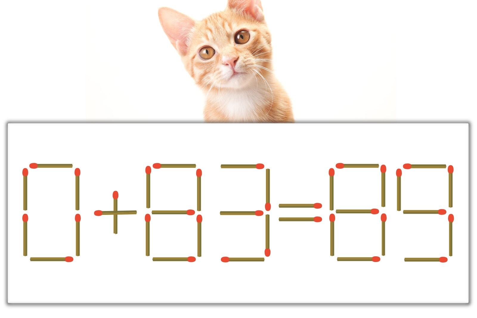 問題の「0」を別の数字に変化させると答えが導き出せます。0のマッチ棒を1本移動させて、「6」にしてみましょう。すると、「6+83=89」が成立します。