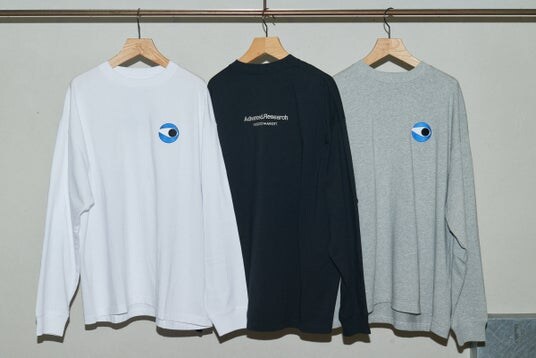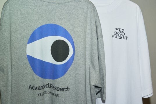 ひとつは、左胸に「ADVANCED RESEARCH」のロゴが刺繍されたTシャツ。もうひとつは、背中にロゴが大きくプリントされたロンT。どちらもアイコニックな目のロゴがプリントされた、YGMだけの別注プロダクトです。