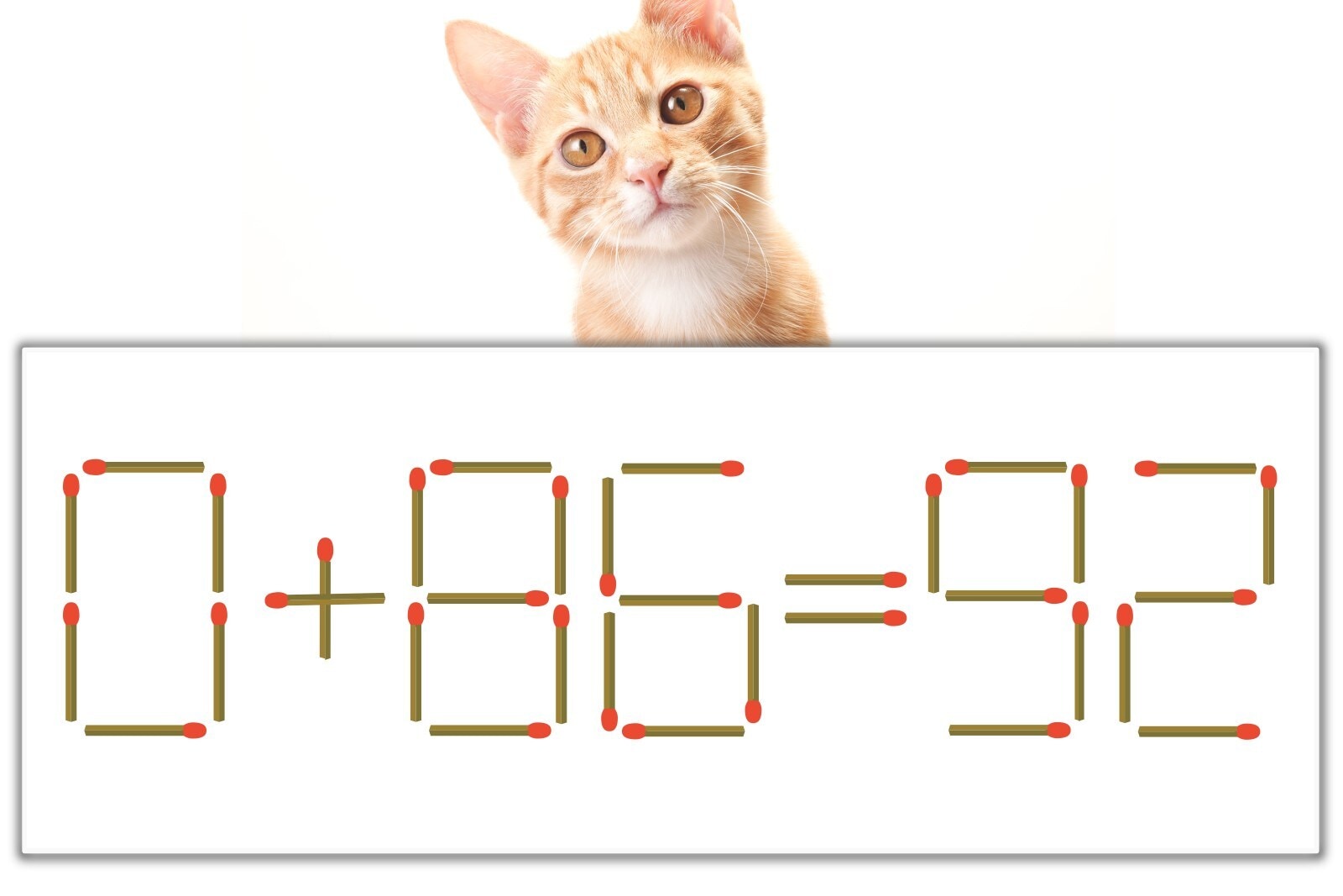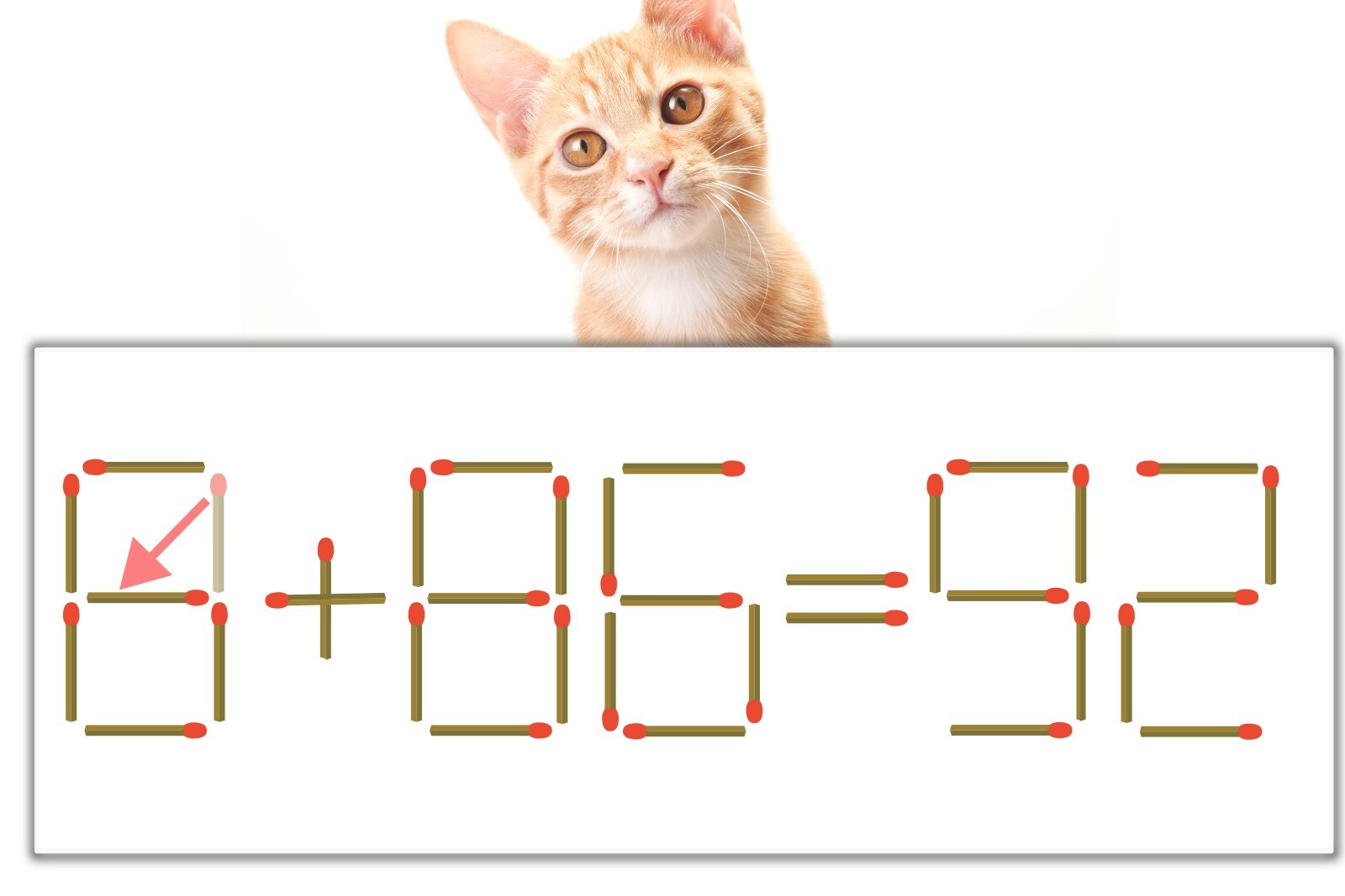 問題の「0」を別の数字に変化させると答えが導き出せます。0のマッチ棒を1本右下へ移動させて「6」にしてみましょう。すると、「6+86=92」が成立します。