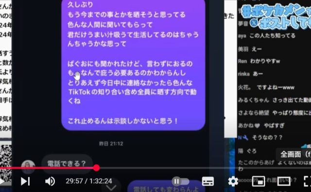 もう今までの事とかを晒そうと思ってる いろんな人間に聞いてもらって君だけうまい汁吸うて生活してるのはちゃうんかな思って(中略)とりあえず今日中に連絡なかったらいろんなTikTokの知り合い含め全員に晒す方向で動くね