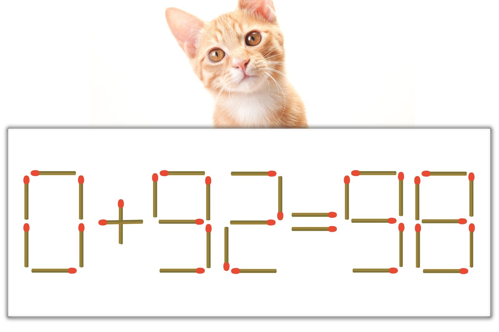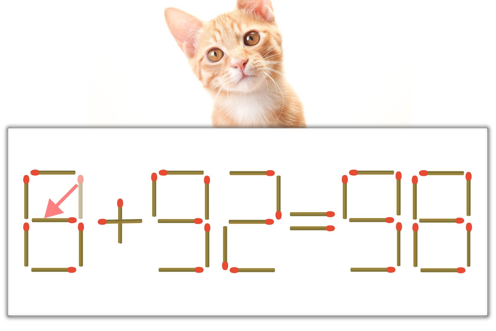 「0」を別の数字に変化させると答えが導き出せます。「0」のマッチ棒を1本移動させて、「6」にしてみましょう。すると、「6+92=98」が成立します。