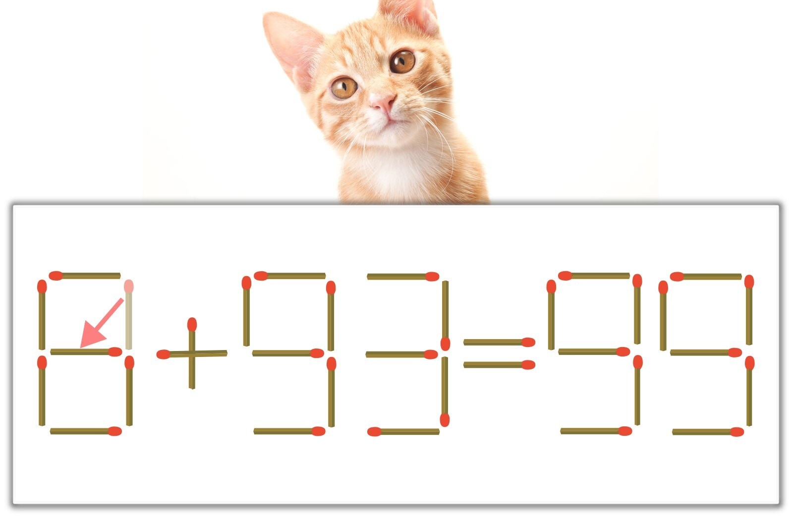 「0」を別の数字に変化させると答えが導き出せます。0のマッチ棒を1本移動させて、「6」にしてみましょう。すると、「6+93=99」が成立します。