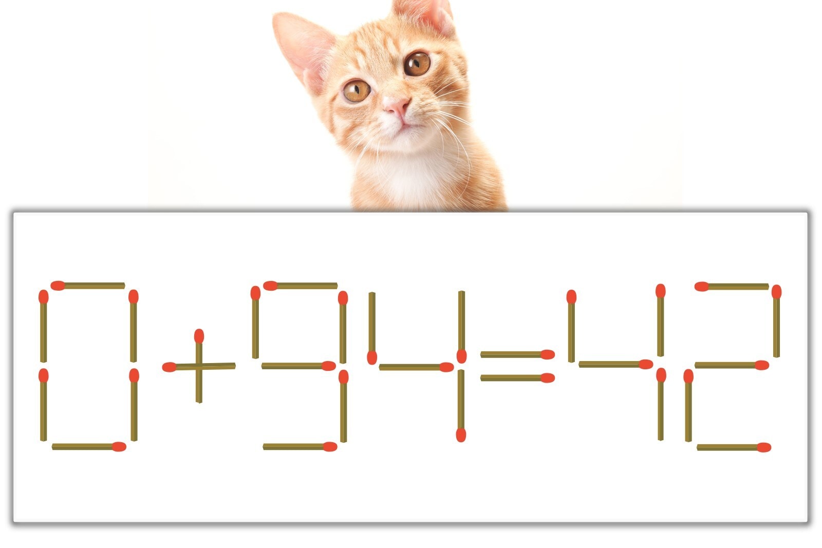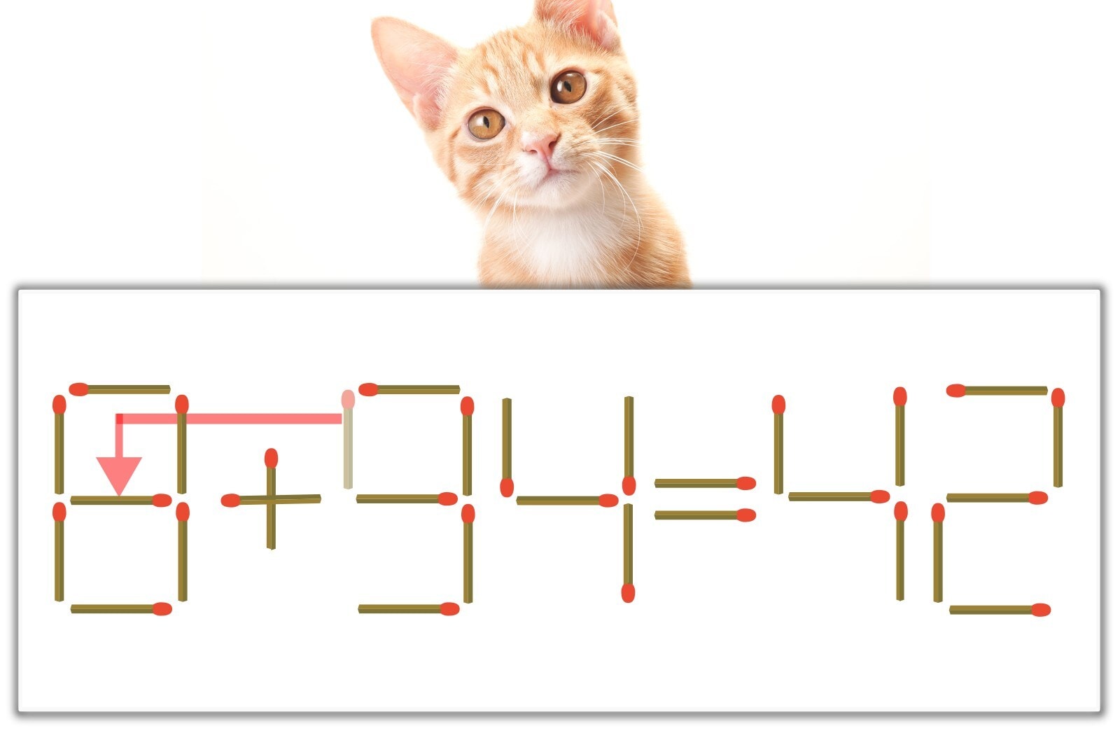 「9」を別の数字に変化させると答えが導き出せます。9のマッチ棒を1本移動させて、「0」を「8」にしてみましょう。すると、「8+34=42」が成立します。