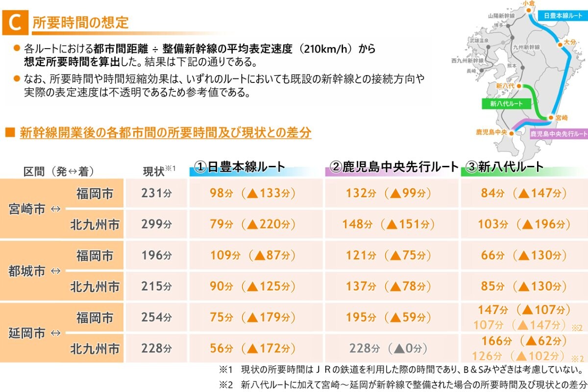 宮崎市―福岡市間は現行231分に対し、日豊本線ルートで98分(133分短縮)、鹿児島中央先行ルートで132分(99分短縮)、新八代ルートで84分(147分短縮)となります。