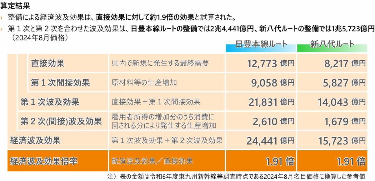 大分を経由する「日豊本線ルート」と、熊本県新八代から宮崎市に至る「新八代ルート」の2案を比較したところ、いずれのルートでも、所要時間の大幅短縮に加え巨額の経済波及効果が見込まれることが明らかになりました。