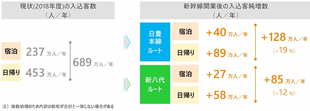 開業後の観光面でも効果が見込まれるとしています。日豊本線ルートでは、年間で宿泊客40万人、日帰り客89万人が増え、合計128万人の来訪者増加を予測。これにより年間234億円の経済効果が見込まれるとしています。新八代ルートでも宿泊客27万人、日帰り客58万人が増加し、年間159億円の効果とされました。宿泊、飲食、運輸など幅広い分野で雇用や税収の押し上げが期待されています。
