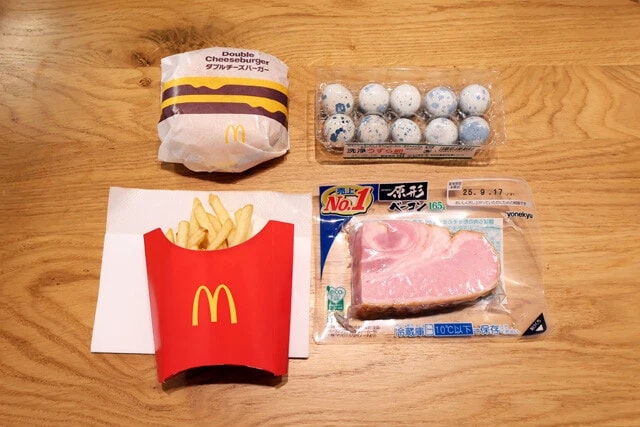 野島 ってことで、今回は月見欲を最大級満たすハイパーな月見バーガーを作ってみせます。まずベースにするのはマックのダブチね。ここに焼いた厚切りベーコンを挟みますよ。