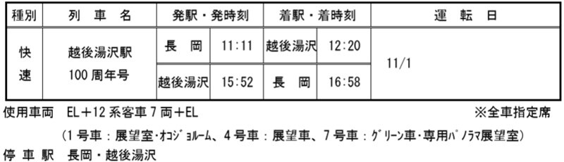 運行ダイヤは長岡11:11発 → 越後湯沢12:20着、越後湯沢 15:52発 → 長岡16:58着。全車指定席です。