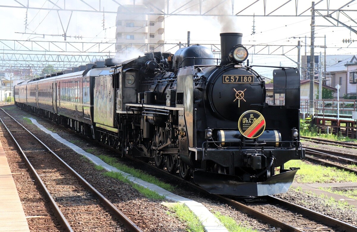 「SLばんえつ物語」は、新津駅~会津若松駅間を磐越西線経由で運行している臨時快速列車。1999年4月から市民の要望などにより動態復元されたSL(C57-180)で、12系を改造した客車をけん引。子どもが遊べるフリースペース「オコジョルーム」がある1号車や、ダイナミックな景色を楽しめる展望車の4号車、「レトロ調大正ロマン」をイメージしたデザインや先頭部のパノラマ展望室があるグリーン車の7号車が特徴で、レトロな車内の雰囲気と眺望を楽しめます。