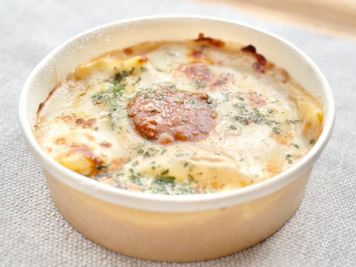 もちもち食感の生パスタを使ったラザニア。お肉の旨みとハーブのきいた大人向けの味わいのミートソースとミートクリームソースの2種ソースを使用しています。