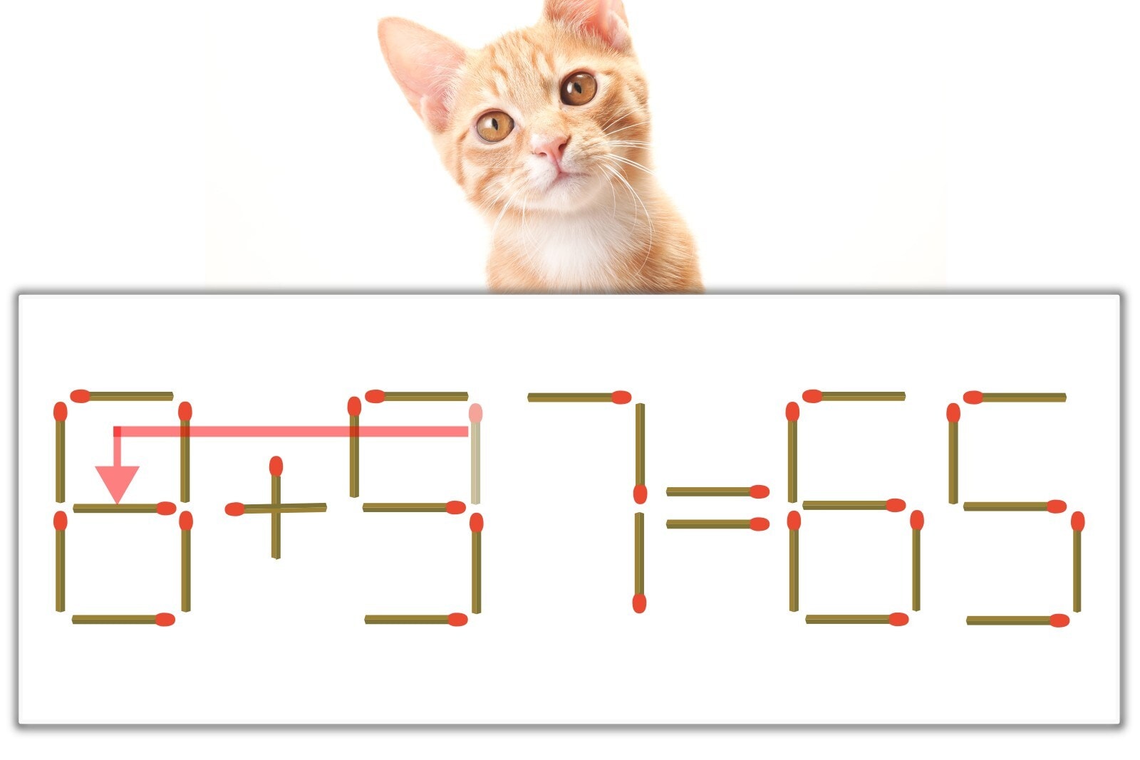 「9」を別の数字に変化させると答えが導き出せます。「9」のマッチ棒を1本左に移動して、「0」を「8」にしてみましょう。すると、「8+57=65」が成立します。