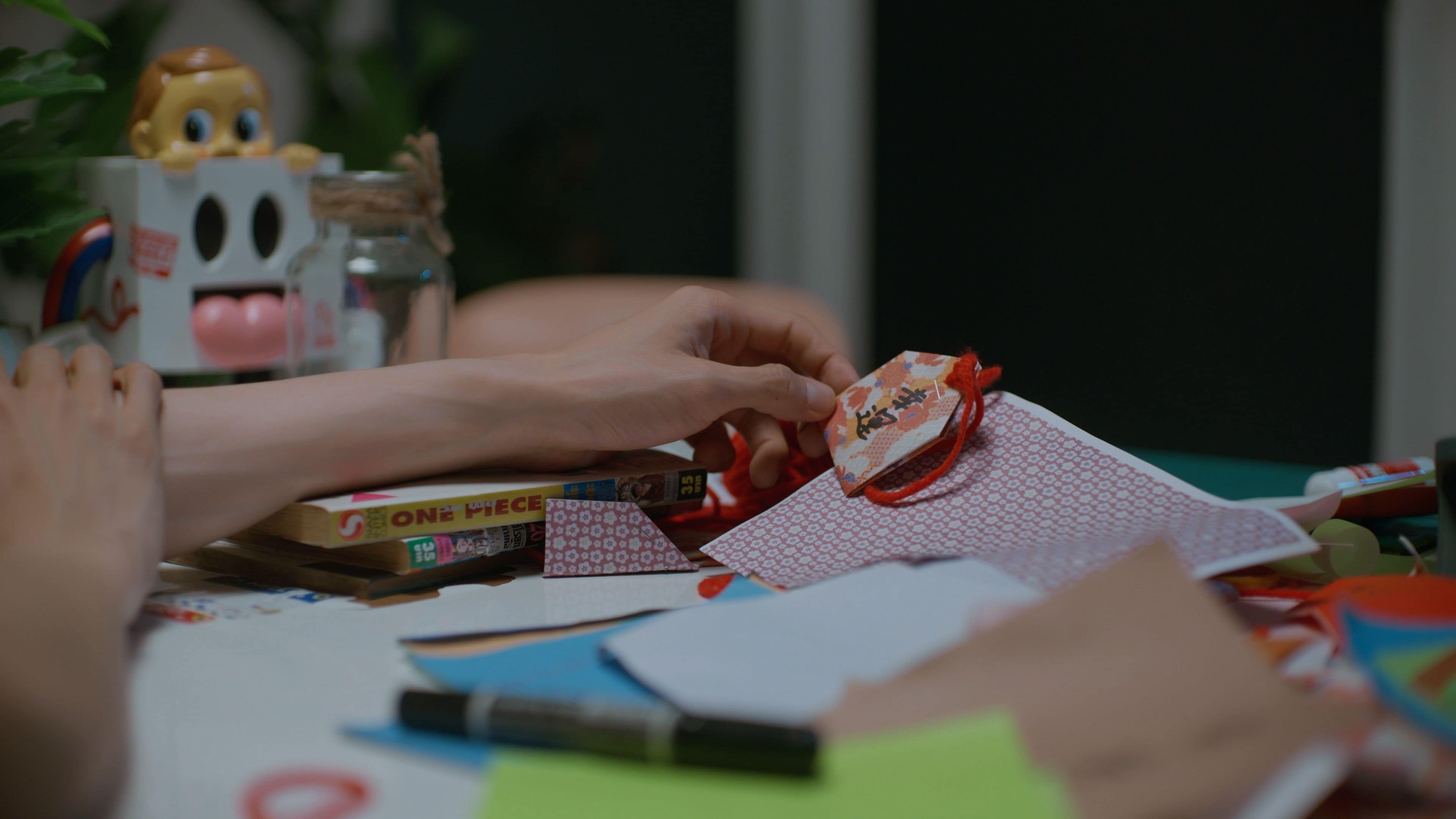 さまざまな困難を乗り越え、迎えた新作ゲームの発表会当日。ヒルはメッセージのやりとり後に手作りのお守りを完成させ、それをジュンジに渡して成功を祈る。