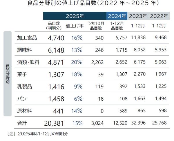 食品分野別では、焼酎やリキュール、日本酒などアルコール飲料を中心とした「酒類・飲料」が最も多く、2262品目。2025年通年では、12月までの公表分で累計2万381品目になっている。