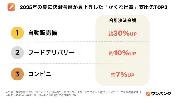 「ワンバンク」利用者のうち、ワンバンクカードで決済をした約25万人分のデータを無作為に抽出し、7〜8月の支出のうち1回あたりは少額だが頻度が高い「かくれ出費」になりがちな支出を分析した調査では、合計決済金額が増加した「かくれ出費」の支出先1位が「自動販売機」。夏が始まる前と比べて約30%も増加しており、2位は「フードデリバリー」で約10%増、3位が「コンビニ」で約7%増だった。
