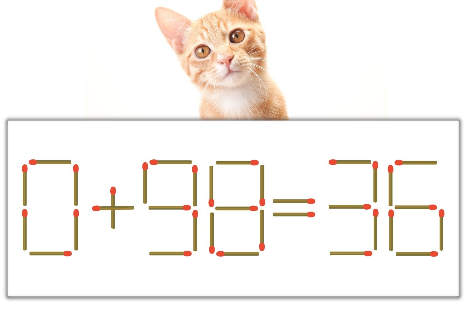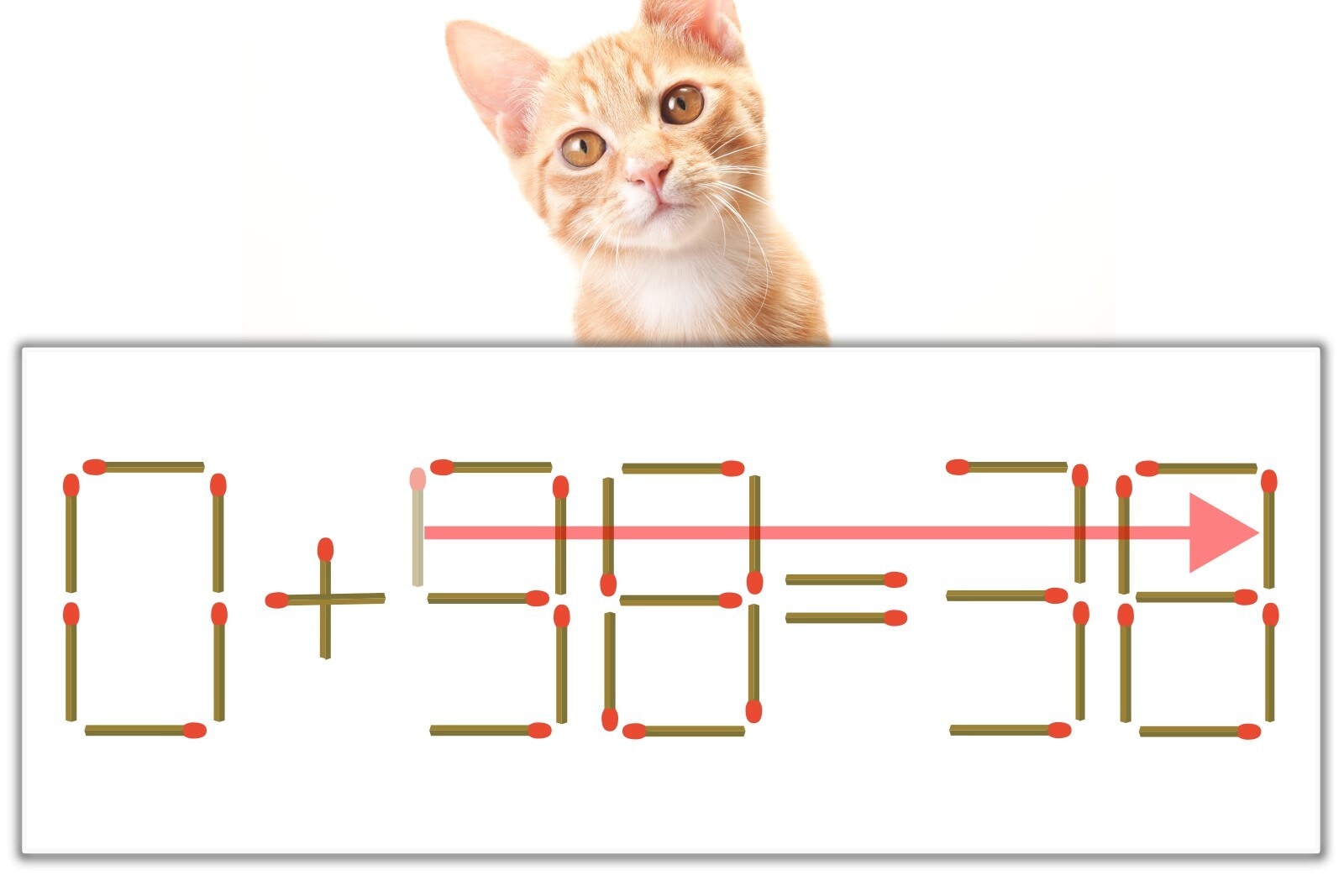 「9」を別の数字に変化させると答えが導き出せます。「9」のマッチ棒を1本解答の「6」のマッチ棒に移動して、「6」を「8」にしてみましょう。すると、「0+38=38」が成立します。