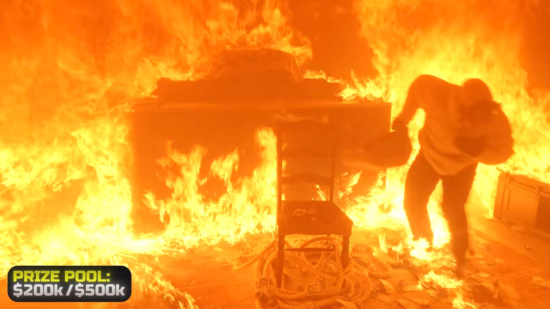 冒頭に登場した“燃える家からの脱出”では、エリックは両手を縛られてイスに座っている状態で登場。背後には現金50万ドルが積み上げられており、その後ろで炎が上がっていました。炎が広がる中、エリックは縄を解いて現金の入った袋を建物の外へ急いで運び出します。部屋全体が炎に包まれる中、エリックは何度も部屋に戻って現金を運び出し、25万ドルを獲得。家は焼失で、エリックは足に火がついて消火器で消してもらっていました。この過激な光景に、ミスタービーストも「これまでの撮影で一番クレイジーだよ」と声を上げていました。