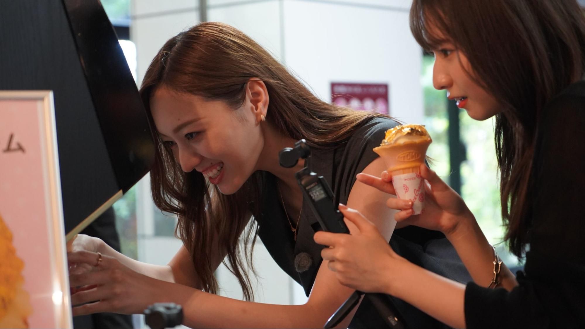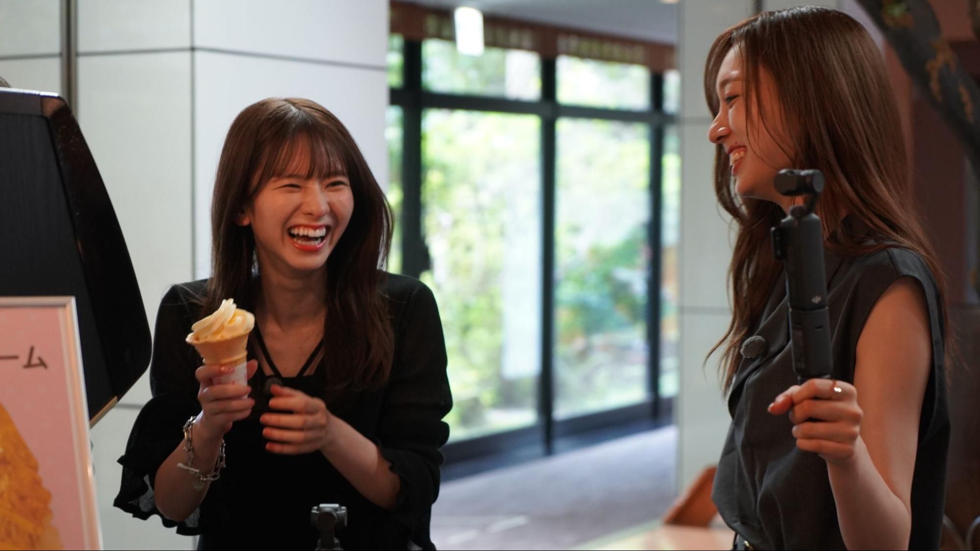 宿の1階で発見した金箔ソフトクリーム体験に挑戦することに。「めっちゃ下手ですよ。下手界No.1」と不安そうな菅原が作ったバニラのソフトクリームの形は平べったく、すでに食べかけのよう。おそるおそる金箔を乗せるも残念な仕上がりになってしまった。続いて梅澤が抹茶のソフトクリーム作りに挑戦。「笑っちゃうよ!」と言いながらもなんとか仕上げる。自分で作った金箔ソフトクリームを食べた梅澤は「美味しい!」と感激。「金箔って感じ」と言いながら食べる菅原に、梅澤は「金箔って味ある?」とツッコむのだった。