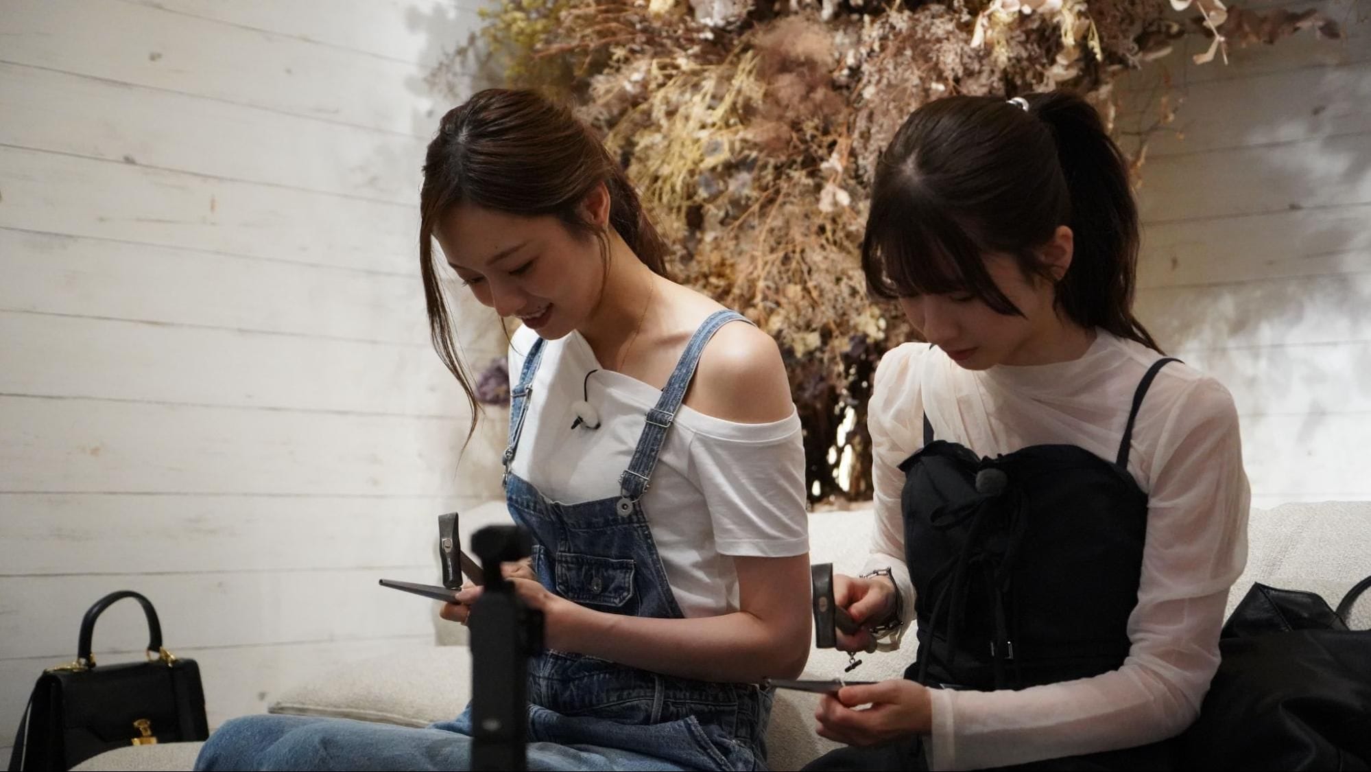 お店の人に教わりながら早速指輪づくりを開始する。まずはリングを叩いて加工していく。真剣な表情でリングを叩く2人。店内には、リングを叩く涼やかな音が鳴り響く。ようやく形を整え、仕上げ作業を待つこと15分。2人は出来上がったリングに感激し、早速はめてみるのだった。
