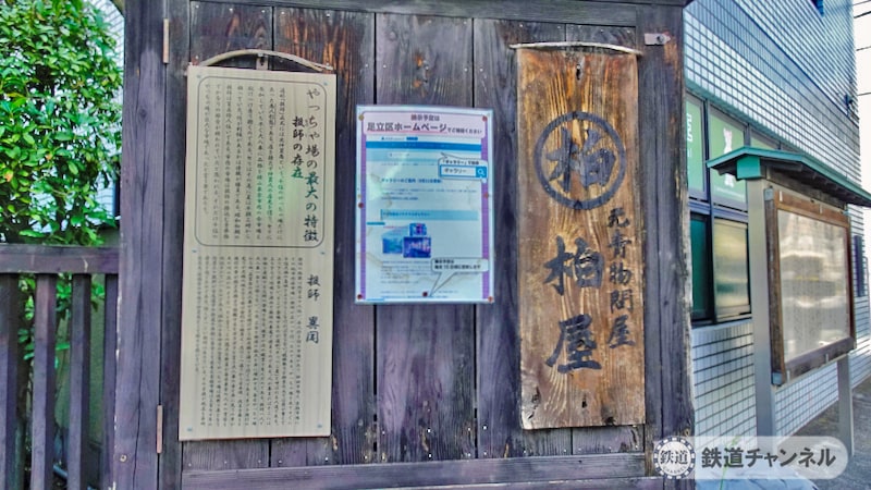 入口の右に「元青物問屋 柏屋」の木札と「やっちゃ場の最大の特徴 投師の存在」の説明パネルがあります。